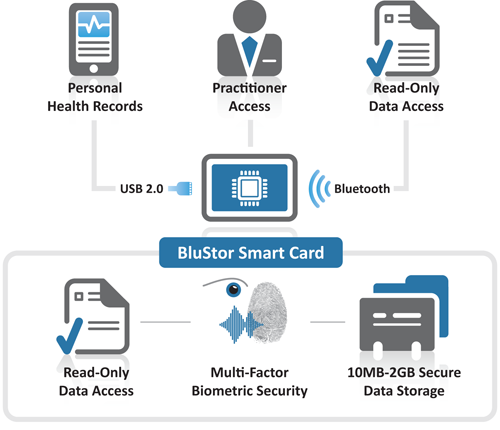 The technology required to carry personal medical data securely and conveniently is a reality: BluStor. The BluStor platform consists of a large storage capacity (up to 8GB) flash memory integrated into the ubiquitous smart card form factor, and it interfaces to all standard industry connections — including USB 2.0 and Bluetooth — making the BluStor Smart Card compatible with virtually any mobile device, including iPhones, iPads and laptops.